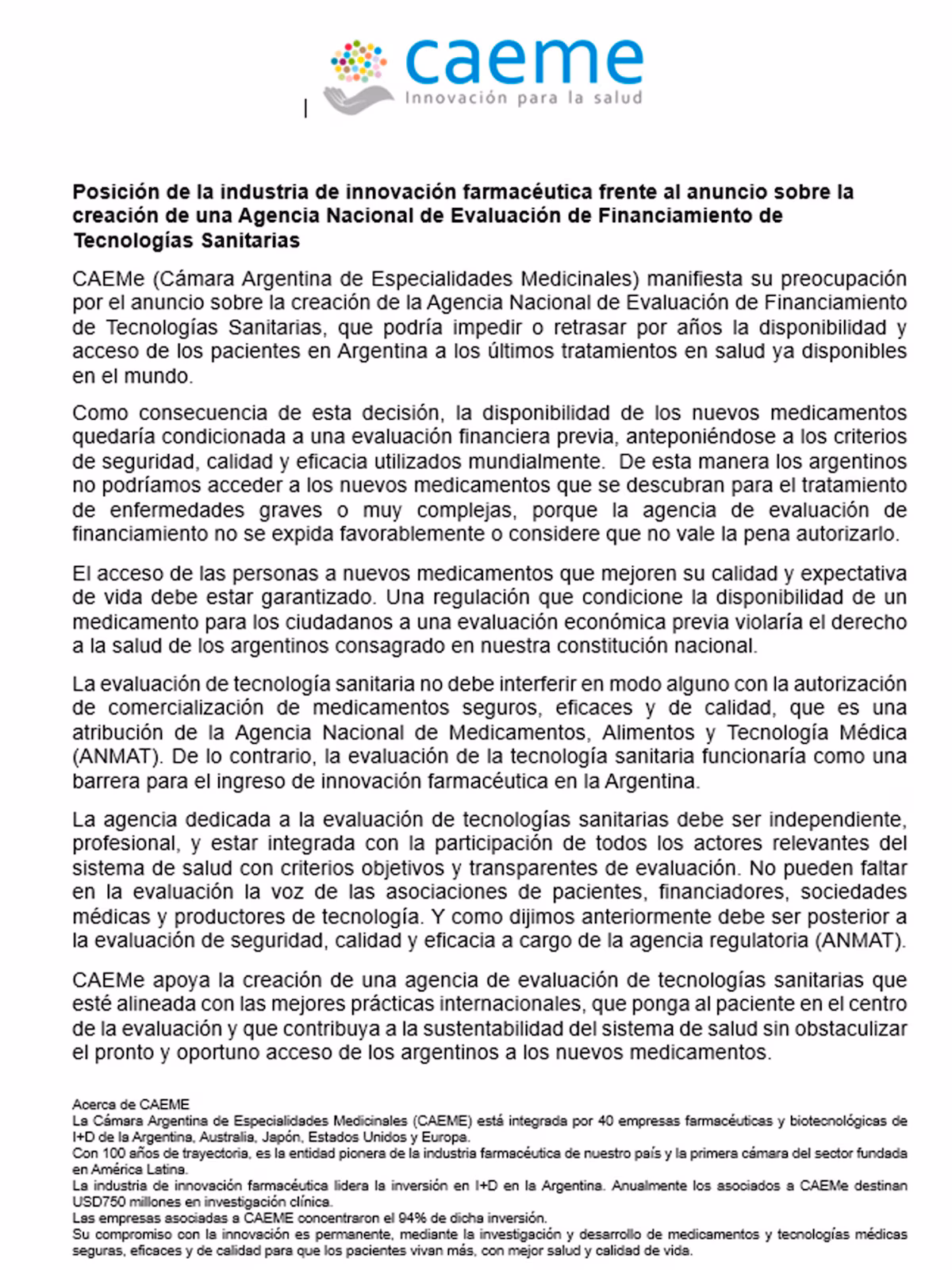 Una vez conocida la noticia de la flamante agencia, la cámara que agrupa a los laboratorios multinacionales expresaron su postura al respecto. Se trata de la Cámara Argentina de Especialidades Medicinales (CAEMe), que manifestó "su preocupación por el proyecto de normativa sobre evaluación de tecnologías sanitarias que se está discutiendo en el Ministerio de Salud de la Nación, que podría impedir o retrasar por años la disponibilidad y acceso de los pacientes en Argentina a los últimos tratamientos en salud ya disponibles en el mundo". De confirmarse esta decisión, alertaron, "los argentinos no podremos acceder a los nuevos medicamentos que se descubran para el tratamiento de enfermedades graves o muy complejas, porque la autoridad no se expida favorablemente o considere que no vale la pena autorizarlo". "Debemos garantizar el acceso de los pacientes a nuevos medicamentos que mejoren su calidad y expectativa de vida. Una regulación que condicione la disponibilidad de un medicamento para los pacientes a una evaluación previa violaría el derecho a la salud de los pacientes consagrado en nuestra constitución nacional", agregaron. Según la CAEMe, la evaluación de tecnología sanitaria "debe estar orientada a los pacientes, no interferir en modo alguno con la autorización de comercialización de medicamentos seguros, eficaces y de calidad, que es una atribución de la ANMAT, y no ser una recomendación vinculante para los financiadores de la salud. De lo contrario, la evaluación de la tecnología sanitaria funcionaría como una barrera para el ingreso de innovación farmacéutica en la Argentina". "La institución dedicada a la ETS debe ser independiente, profesional, e integrada con la participación de todos los actores relevantes del sistema de salud con criterios objetivos y transparentes de evaluación. No pueden faltar asociaciones de pacientes, financiadores, sociedades médicas y productores de tecnología", marcaron. Por eso, CAEMe "apoya la creación de una agencia de evaluación de tecnología sanitaria que esté alineada con las mejores prácticas internacionales y que ponga al paciente en el centro de la evaluación de nuevos medicamentos, sin obstaculizar el pronto y oportuno acceso a los mismos".
